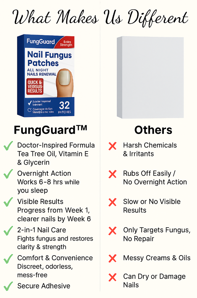 Enriched with Tea Tree Oil, Vitamin E, and Glycerin, FungGuard™ targets fungus while hydrating and protecting damaged nails. Each easy-to-apply patch delivers soothing, strengthening care that reduces yellowing, brittleness, and cracks—promoting a cleaner, healthier nail surface. Perfect for weak, split, or fungus-affected nails, FungGuard™ works while you sleep to restore strength, clarity, and confidence, without messy creams, strong odours, or harsh chemicals.